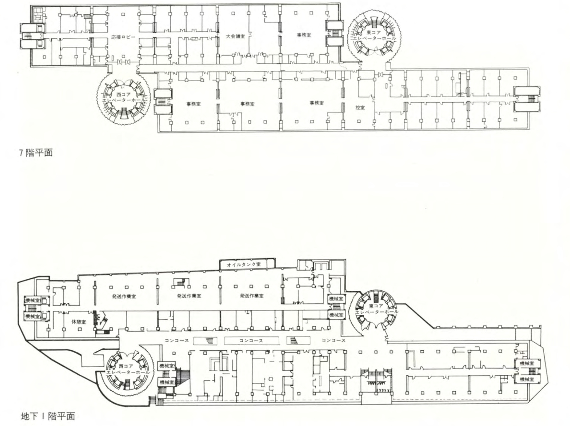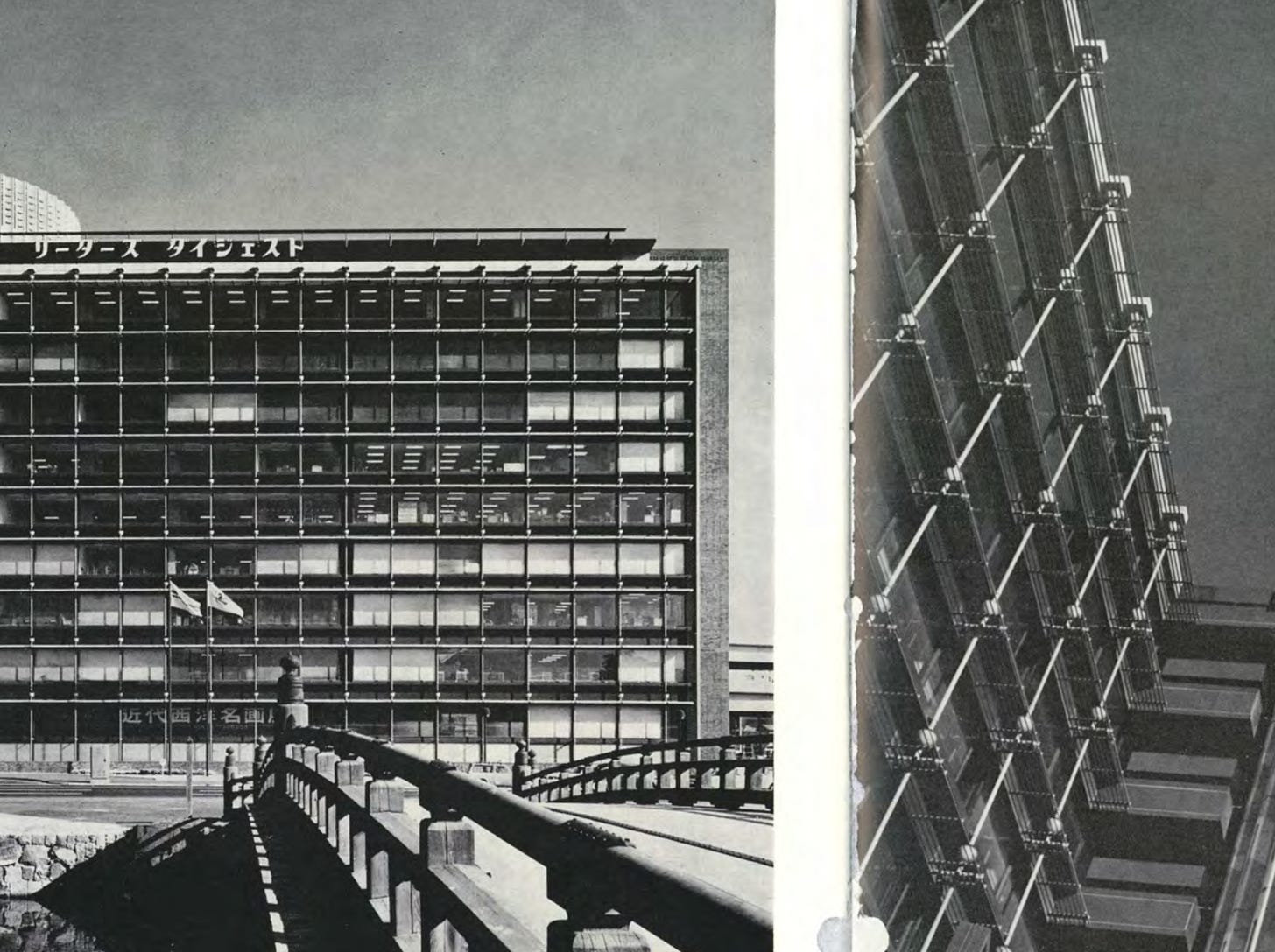 was the reason given for the demolition of Antonin Raymond’s original building on this site. It was a low, long block. I’ve only seen it in black-and-white pictures. It stood for ten years. Raymond was commissioned to build the Japanese Village at Dugway Proving Grounds, but, more importantly, he had been granted the land beside the Imperial Palace as a favor from the Supreme Commander of the Allied Powers. Some kind of local intellectual pride was at stake, Hayashi Shoji seems to be saying in his interview. Perhaps, like many other stories about Tokyo, this was about competition between real