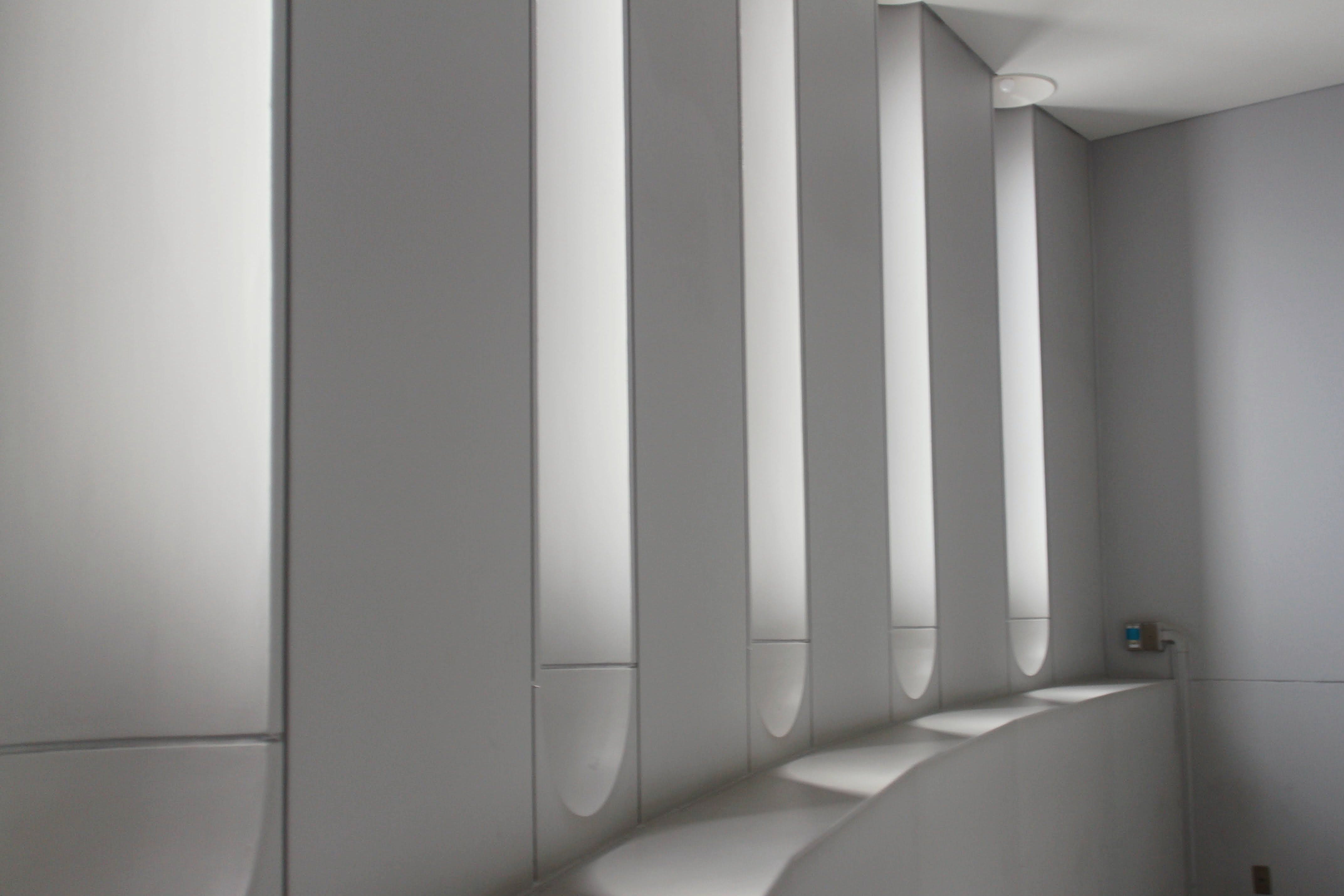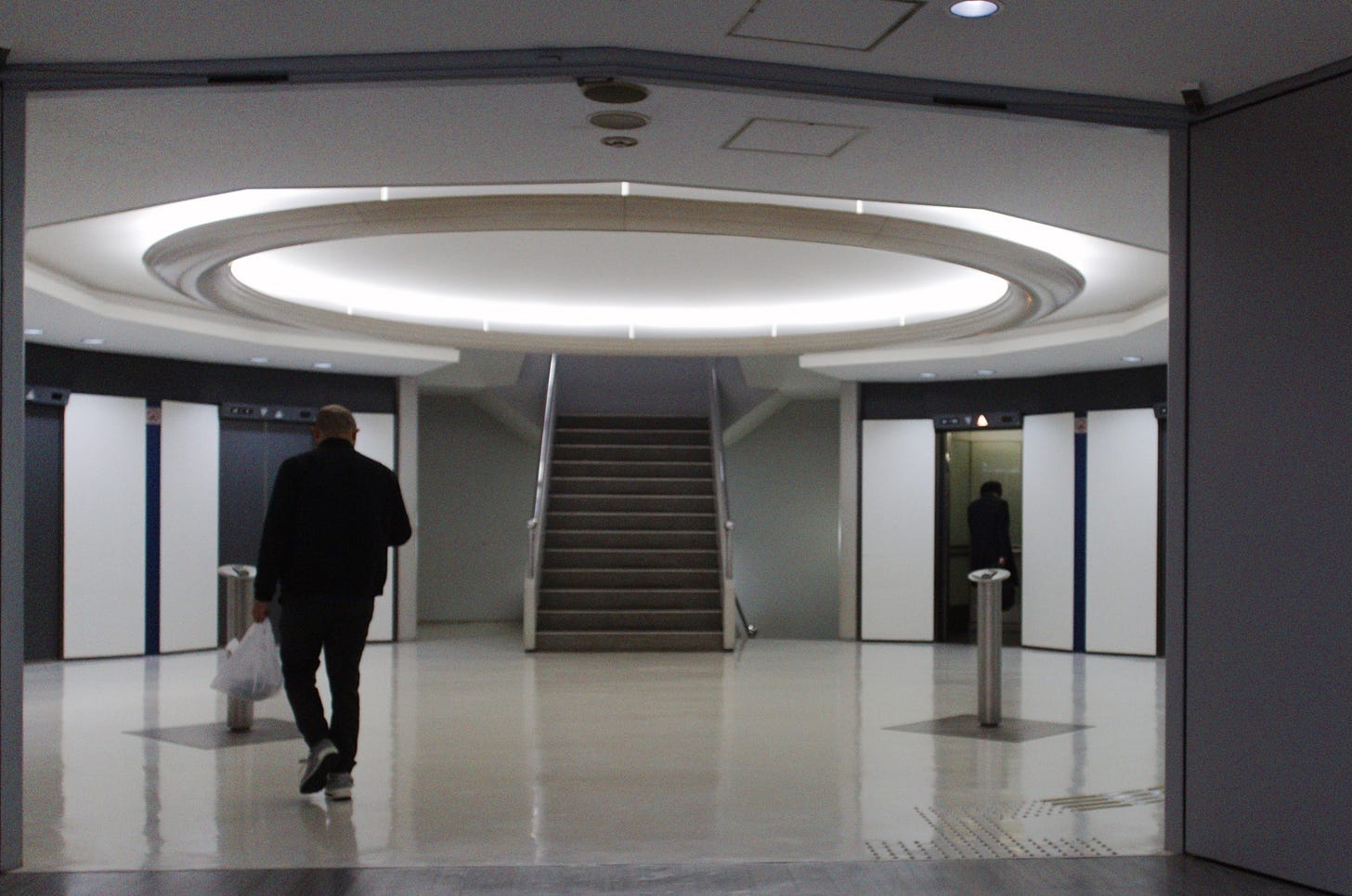could dream in those years of the entire city remade in the same style. The crumbling blocks in Marunouchi could be knocked down, just as quickly as the slums of East Tokyo were cleared away. I feel like I’m in a spaceship. I want to step out of history. I was so disappointed when I went into the first floor public bathrooms and found that the urinals had not been conserved. Not even the blocky mid-nineties numbers remained from prior renovations. In their place were angular, narrow plastic-sided tubes. They would have looked at home in one of the Minato